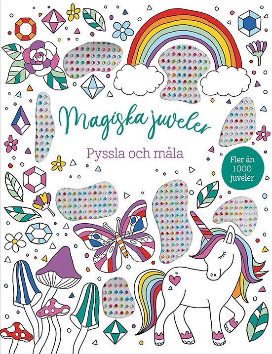 Måla dig fram genom dessa förtrollande landskap fyllda med magiska varelser och vackra ting! Plocka sedan fram arket med fler än 1000 färgglada juvelklistermärken och låt de skimrande färgerna smycka dina konstverk.