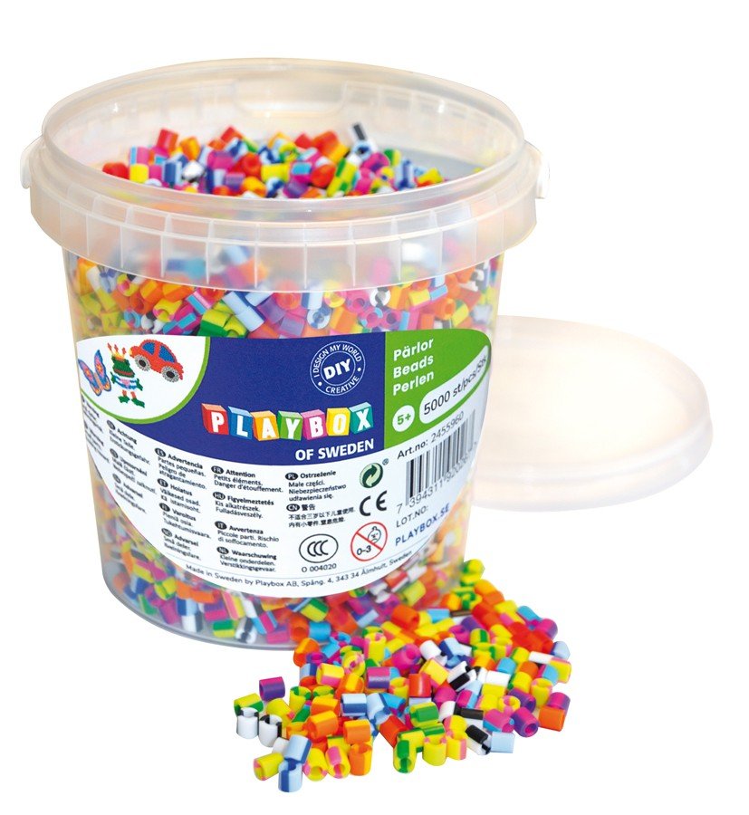 Fina pärlor och praktiskt att förvara då pärlorna kommer i en hink med handtag. Det är även lätt för barnen att ta fram pärlorna och bära runt på hinken utan att riskera att pärlorna trillar ut.