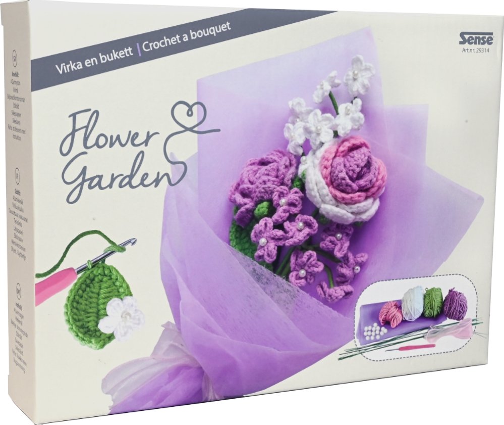 Komplett virkset för att skapa en dekorativ blombukett i lila nyanser. Setet innehåller allt material som behövs för att virka hela buketten enligt motivet på förpackningen, vilket gör det lämpligt för både nybörjare och mer erfarna inom handarbete.